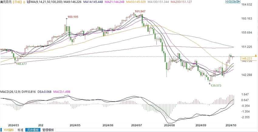 美元兑日元技术面倾向上行,阻力位148.70和149关口!(2024年10月16日)